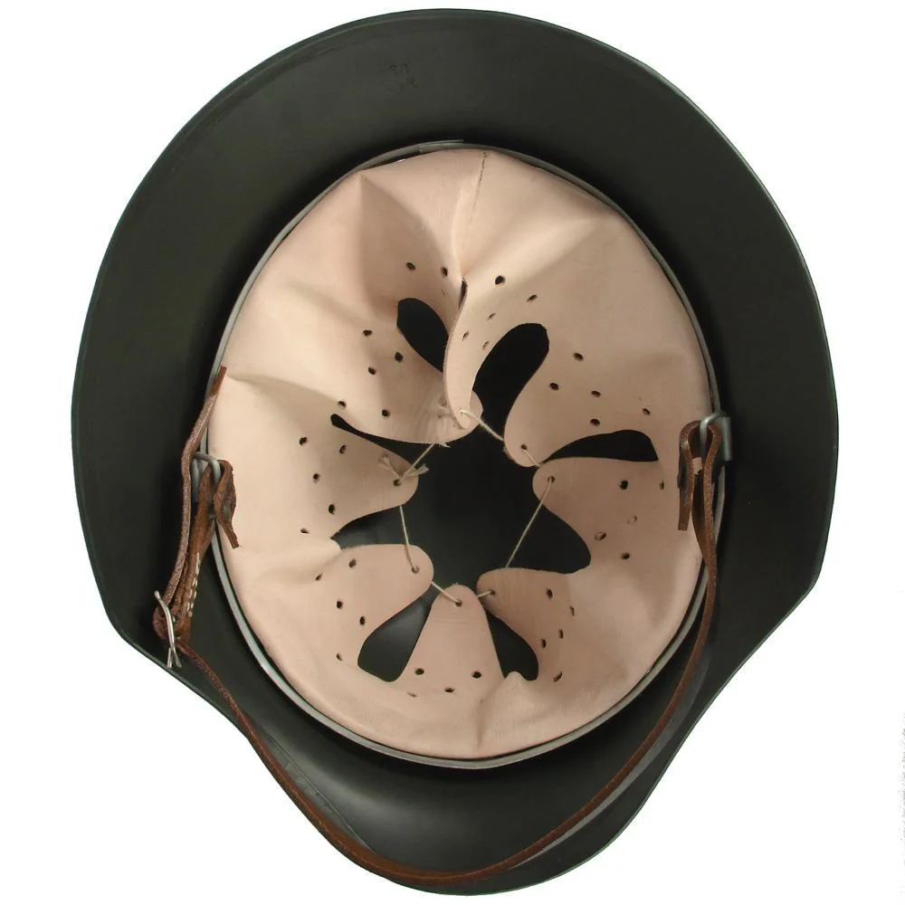 Although named by the German manufacturer as a M35, these helmets are more accurate of a M40 (mainly due to the stamped ventilation hole). This among other minor details was done during war time to speed up/cheapen production. The stamped shell size (64 or 68cm) and manufacturer on the center of the helm, the rolled steel edge, and the leather liner and chin strap are all close to the original design. Made from a tough steel shell, it's similar in weight and colour to genuine M35/M40 models.